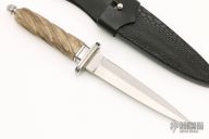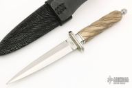 This Dagger by Todd Kopp features a hand rub satin finished double-edged blade with .169" blade stock and .944" blade depth, hidden tang construction. The handle has stainless steel guard, butt and collar with fileworked nickel silver spacers, spiral fluted oosic grip with twisted silver wire inlays. Comes with a black leather sheath and frog. Has a few light spots on the blade, otherwise excellent condition.