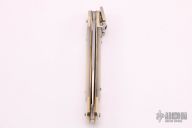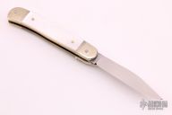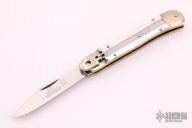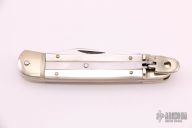 This leverlock auto by Hubertus features a clip point blade, nickel silver double bolsters, mother-of-pearl scales, and brass liners and pins. Opens with a nice snap. Very fast opening. Has some light scratches otherwise excellent condition.