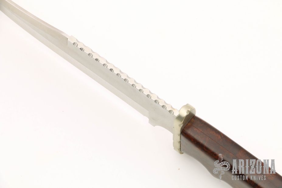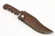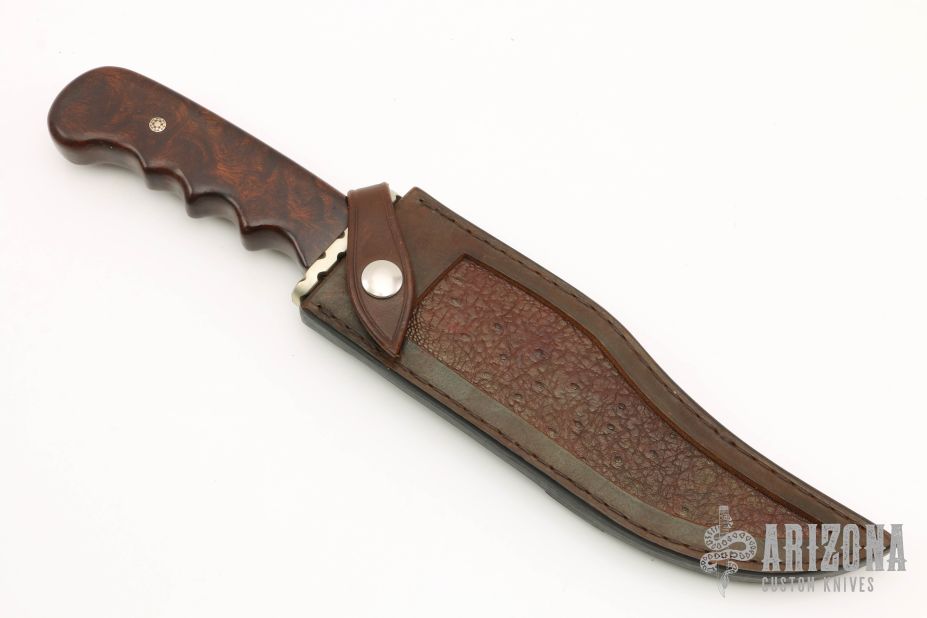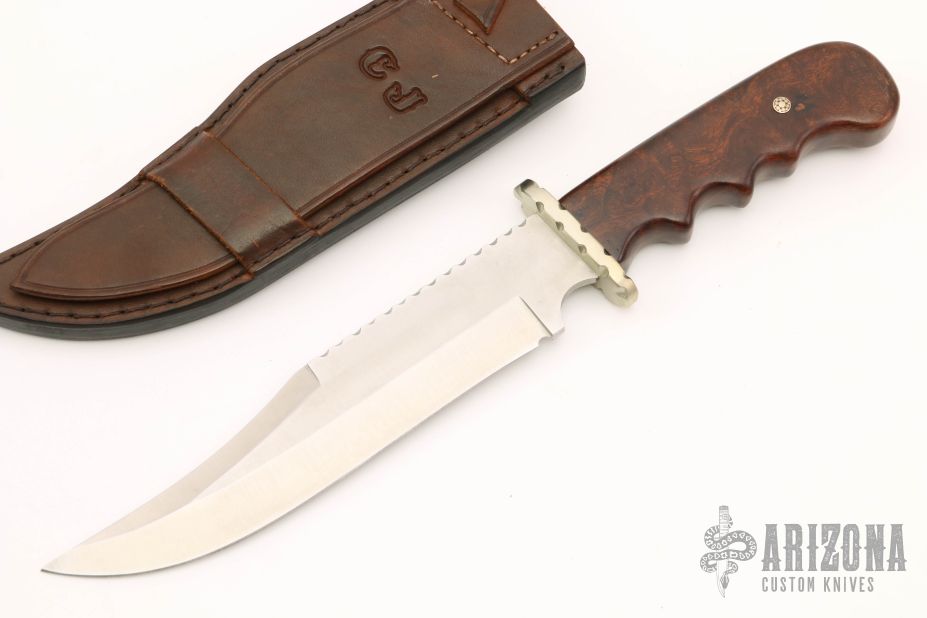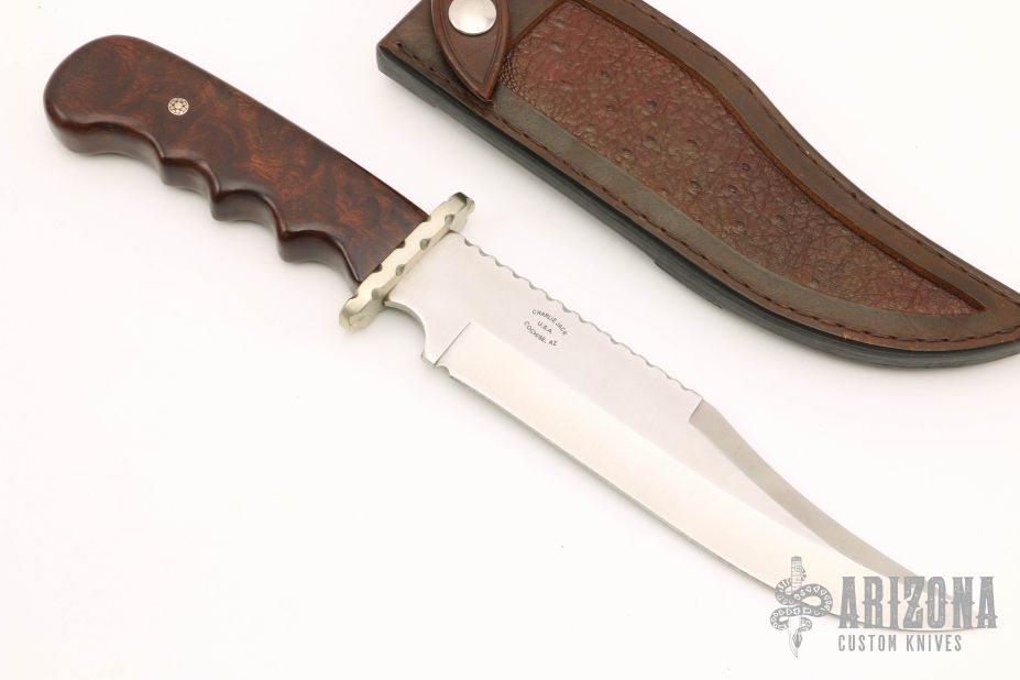 This Bowie by Charlie Jack features a satin finished blade with false top edge and fileworked spine, .189" blade stock and 1.571" blade depth, mortise/hidden tang construction. The handle has a fileworked nickel silver guard, ironwood burl grip and a mosaic pin. Comes with a brown leather sheath. Has a few light scratches, otherwise excellent condition.
