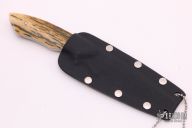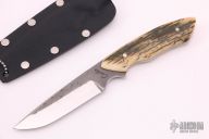 This Neck Knife by Master Smith Murray Carter features a San Mai blade with .116" blade thickness and .908" blade depth, full tapered tang construction. The handle has mammoth ivory scales with nickel silver and mosaic pins. Comes with a kydex neck sheath. Has some light scratches from the sheath, otherwise excellent condition.
