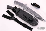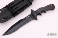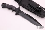 This Hammond Flesh Eater by CRKT features a black double edged blade with notched thumbrest, .238" blade stock and 1.461" blade depth, hidden tang construction. The handle is two-piece black G-10 with hollow tube pins. Comes with molded plastic sheath with molle clips. #2208 on blade. Excellent condition. Comes with original box, rubber trainer, shoulder harness and papers.