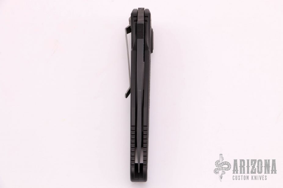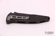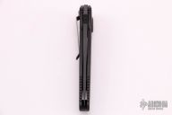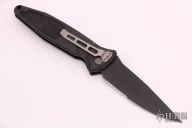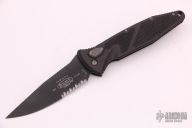 This Socom Elite Auto from Microtech has a black partially serrated blade. The handle is comprised of black anodized aluminum with non-slip inserts. Tip down stainless steel pocket clip. Dated 11/2000, S/N 1836. Comes with original box and papers. Has a couple light scuffs, otherwise excellent condition.