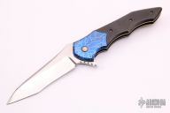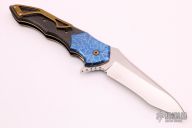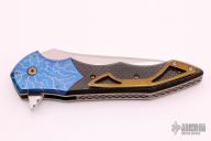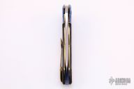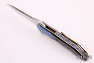 This knife by Cory Martin features a polished blade with a fileworked flipper. The handle has anodized and textured titanium bolsters, carbon fiber scales, anodized titanium liners and tip up clip, anodized titanium backspace with copper spacers. Nice detent, lockup and blade seating, rides on IKBS. Comes with a zippered case. Excellent condition.