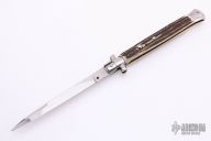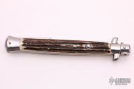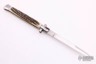This Swivel Bolster Auto has a stainless steel spear point blade. The handle is composed of a steel front and rear bolsters, brass liners all complemented by stag scales. Excellent Condition.