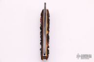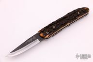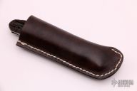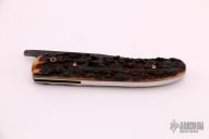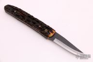 The Bitchu-no-Kami is a traditional Japanese-style folder. The blade is Stainless clad Aogami Super Steel (NAS) which is a high-carbon steel alloy with vanadium and is ground on both sides. Handle constructed of stag scales with polished stainless steel liners and backspacer. Comes with brown leather pouch. New from maker.