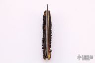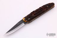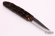 The Bitchu-no-Kami is a traditional Japanese-style folder. The blade is Stainless clad Aogami Super Steel (NAS) which is a high-carbon steel alloy with vanadium and is ground on both sides. Handle constructed of stag scales with polished stainless steel liners and backspacer. Comes with brown leather pouch. New from maker.