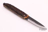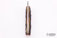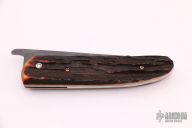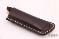 The Bitchu-no-Kami is a traditional Japanese-style folder. The blade is Stainless clad Aogami Super Steel (NAS) which is a high-carbon steel alloy with vanadium and is ground on both sides. Handle constructed of stag scales with polished stainless steel liners and backspacer. Comes with brown leather pouch. New from maker.