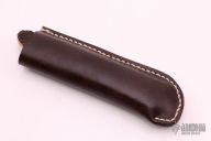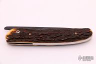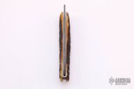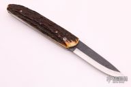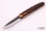 The Bitchu-no-Kami is a traditional Japanese-style folder. The blade is Stainless clad Aogami Super Steel (NAS) which is a high-carbon steel alloy with vanadium and is ground on both sides. Handle constructed of stag scales with polished stainless steel liners and backspacer. Comes with brown leather pouch. New from maker.