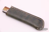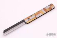 The Bitchu-no-Kami is a traditional Japanese-style folder. The blade is Stainless clad Aogami Super Steel (NAS) which is a high-carbon steel alloy with vanadium and is ground on both sides. Handle constructed of nickel silver with brass/copper/nickel silver overlays. Comes with leather pouch. New from maker.