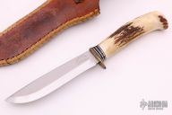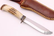 This Morseth Brusletto Geilo Stag Hunter has a polished laminated steel clip point blade with hidden tang. Handle is stag antler with brass single guard and black, silver and red spacers. Comes with custom Morseth brown leather sheath with belt loop. Has some light scratches, otherwise excellent condition.