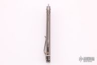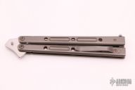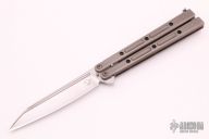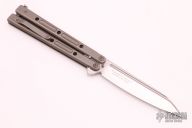 This Vulcan Balisong by Bastinelli Knives features a satin finished blade with notched thumbrest and milled fullers. The handles are blasted and anodized titanium with tip up clip. Comes with zippered case and COA. Excellent condition.