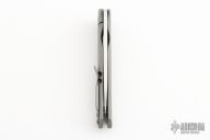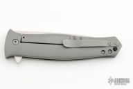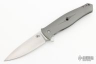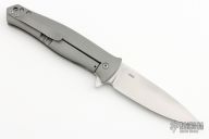This Dr. Death is a flipper by Tom Mayo. The Dr. Death flipper has very smooth action and good detent, lockup and blade seating. Bead blasted titanium frame with "The Gash" accent, standoffs, lanyard hole. The blade is hand rub satin finished with flipper. Has a couple light scuffs, otherwise excellent condition. Comes with a Velcro case.