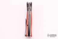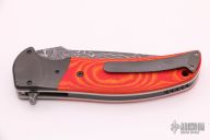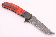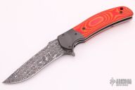 The RJ Martin Q-36 won the award for Best Tactical Folder at the 2007 Blade Show in Atlanta. This Q-36 flipper from RJ Martin features a Damascus blade with notched thumb ramp and flipper The handle has zirconium bolsters, satin finished titanium liners, red/yellow Carbo Quartz scales, zirconium backspacer and milled tip up clip. Powerful and smooth flipper opening allows you to easily deploy the blade with no wrist action needed. Nice blade seating, detent and lockup. Excellent work. Comes with zippered case. Excellent condition. This knife was made in 2020 and is a One-Off.