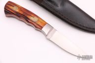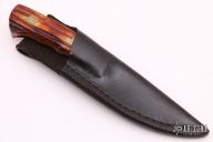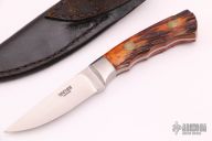 This knife by Charles Weiss features a satin finished blade with .176" blade stock and .786" blade depth, full tapered tang construction. The handle has integral stainless steel bolsters, stag scales. Comes with a black leather sheath. Has a few light scratches, otherwise excellent condition.