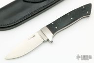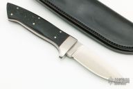 This knife by CJ Deubel features a satin finished blade with .236" blade stock and .983" blade depth, full tapered tang construction. The handle has a stainless steel guard, black G-10 scales with red liners and a lanyard hole. Comes with a black leather sheath. Has some light scratches and a couple spots on the blade, otherwise good condition.