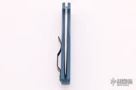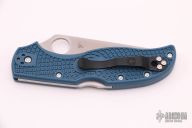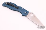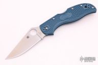 This Spyderco Stretch 2 has a plain edged satin finished blade with thumbhole and notched thumbrest. The handle has blue/grey FRN scales, stainless liners and backspacer and a black stainless 4-way reversible clip. Includes the original box and papers. Excellent condition.