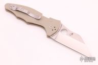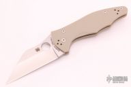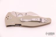 This Yojimbo 2 by Spyderco features a satin finished wharncliffe blade with thumbhole. The handle has a tan G-10 frame with stainless steel liners, lock is on the spine of handle. 4-way reversible stainless steel clip. Nice detent, lockup and blade seating. Comes with original box and papers. Excellent condition.