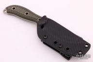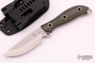 This Active Duty by Busse Custom Shop features a drop point satin finished ELMAX blade, .097" blade stock and 1.070" blade depth, full tang construction. The handle has green/black G-10 scales with hollow tube pins and lanyard hole. Comes with kydex sheath with TekLok by BuyBrown. Excellent condition.