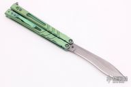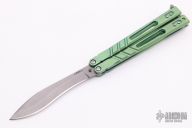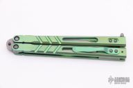 This Premium Alpha Beast has been outfitted with a kukri blade, with anodized titanium handles, and a titanium pocket clip. This precision machined butterfly knife features perfectly balanced titanium handles with robust pivots tuned for easy manipulation. It comes equipped with a stonewashed 154CM blade with a crowned spine and dual tang pins.