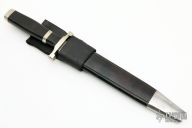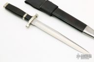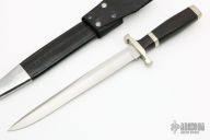 This Slim Fighter by Dan H Hanson features a satin finished blade with sharpened top edge, .150" blade stock and .898" blade depth, hidden tang construction. The handle has a nickel silver guard and butt and a blackwood grip with nickel silver spacer. Comes with a black leather and nickel silver scabbard. Has a few light scratches, otherwise excellent condition.