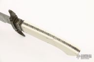 This Bowie by Konnor Kopp features a Damascus blade with false top edge, .160" blade stock and 1.568" blade depth, hidden/mortise/frame tang construction. The handle has a plum brown steel guard and collar with fileworked nickel silver spacer, walrus ivory scales with fileworked nickel silver liners and a plum brown steel frame. Comes with a black leather sheath with an ostrich leg skin overlay. Has some cracks around the pins, otherwise excellent condition.