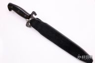 This custom Crossada was designed by Master at Arms James Keating and made by Robert Newton, it has a double edged bayonet ground blade, .244" blade stock and 1.604" blade depth, full tang construction with wood scales. Comes with a black leather sheath and aluminum quillions that fit into the hole in front of the handle, the knife does not fit into the sheath with the quillions installed. Has a couple light scratches, otherwise excellent condition.