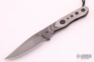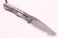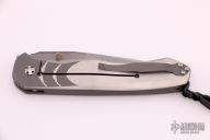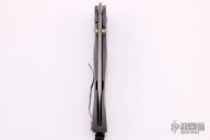 This Non-Typical Lochsa from Scott Cook features a Damascus blade (19C27/302/D2) with gold ramped and notched thumbstuds and a fileworked thumbrest. The handle has an integral two-tone titanium frame and tip up clip, carbon fiber inlaid pivot, carbon fiber and 14K gold pin inlays in the handle. Nice detent, lockup and blade seating. Includes pivot tool and original info card dated August 2016 and original box. A highly desirable piece. Excellent condition.