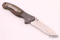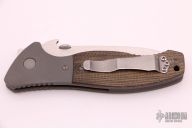 This custom CQC-11 by Emerson Knives features a hand-ground satin finish blade, bead blast titanium dovetailed bolsters and liners, green canvas micarta scales, black G-10 backspacer, tip up stainless steel clip. Notched thumbrest. Wave feature and thumbdisc. Nice blade seating, lockup and detent. Excellent condition. Comes with original box.