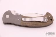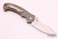 This custom Tiger by Emerson Knives features a satin finished blade with notched thumbrest, thumbdisc and wave feature. The handle has dovetailed bead blasted titanium bolsters and liners, green canvas micarta scales, black G-10 backspacer and tip up stainless steel clip, tip up carry. Comes with original box. Excellent condition.