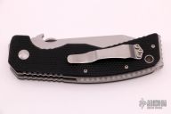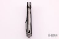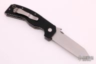 This XHD-HMMVK-SF by Emerson Knives features a satin and stonewashed chisel ground blade with thumbdisc, wave feature and notched thumbrest. The handle has textured black G-10 scales, tumbled titanium liners and notched backspacer, lanyard hole, tip up reversible stainless steel clip, stainless steel lockface insert. Rides on bearings, nice detent, lockup and blade seating. Comes with original box and papers. #0026 on blade. Excellent condition.