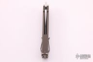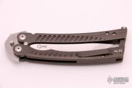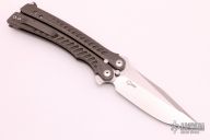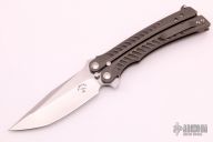 This Badger Balisong by Charles Marlowe features a polished and lightly tumbled clip point blade with a false top edge and notched thumbrest, .170" blade stock. The handle has milled, anodized and lightly orange peel finished titanium handles with matching spacers and T-latch. This is a beautiful balisong, features IKBS. Excellent condition. Hard to come by. Comes with a zippered case.