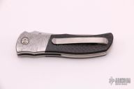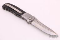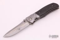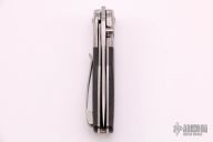 This Micro Starfighter from Bob Terzuola features stonewashed blade with swedge, thumbstud and a notched thumbramp. The handle has Meteorite bolsters, carbon fiber scales, orange peel finished titanium liners, backspace and tip up titanium clip with hidden screws. Comes with a zippered case. Excellent condition.
