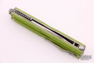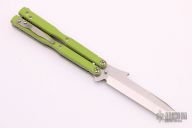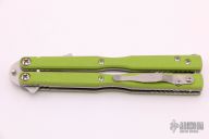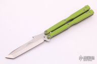 This CQC-7 Balisong by Ernie Emerson features a hand ground by hand tanto blade with wave. The handles have green G-10 scales with titanium liners and tip up clip, adjustable T-latch at the butt. Comes with a zippered case. Excellent condition.