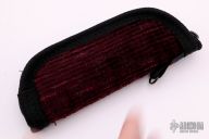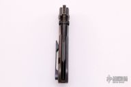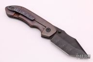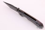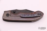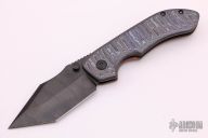 This framelock by Sean Kendrick features a tanto blade with notched thumbrest and zirconium thumbstuds. The handle has a dark timascus front scale and tip up clip, orange peel finished zirconium backspace, orange peel finished and anodized titanium lockside, orange peel finished zirconium pivot. Rides on bearings, nice detent, lockup and blade seating. Comes with a zippered case. Excellent condition.
