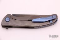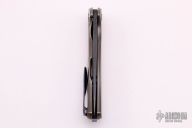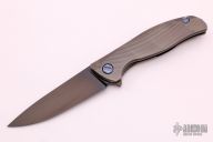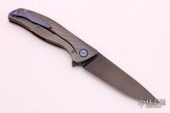 This Full Custom F95 framelock from Shirogorov features a flat ground black finished blade with notched flipper. The handle has a milled and anodized titanium frame with timascus pivot, screws, backspacer and tip up clip, has lanyard hole. Excellent lockup, strong detent, and nice seating. Comes with a Velcro case. Excellent condition. 10V Blade steel.