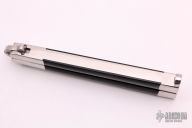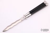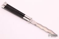 This Jody Samson Ground Kris balisong has a 5" satin finished blade and black linen micarta inserts in the polished stainless steel handles, has T-latch. Comes with a zippered case. Has some light scratches, otherwise excellent condition.