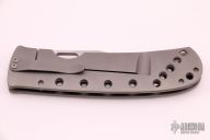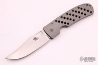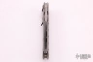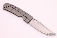 This XL Moran Bowie framelock folder by Tom Mayo features a clip point hand rub satin finished blade with thumbhole and false top edge. The handle has a bead blast titanium frame and tip up clip. Smooth action. Nice blade seating, detent and lockup. Excellent work. Comes with a velcro case. Excellent condition. #010 on the blade as well as his 25th Anniversary logo.