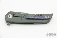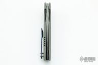 This Super Mini Wyvern Bolsterlock from Walter Randolph features a Damasteel blade with notched flipper. The handle has a bead blasted titanium frame, zircuti pivot collars, floating backspacer and tip up clip. Nice detent, lockup and blade seating. Rides on ceramic bearings and detent. Comes with original case, drawstring bag and COA dated 8-29-21. New from maker at the 2021 USN Gathering.