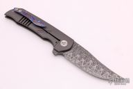 This Super Mini Wyvern Bolsterlock from Walter Randolph features a Mike Norris Damascus blade with notched flipper. The handle has a bead blasted titanium frame, mokuti floating backspacer and tip up clip. Nice detent, lockup and blade seating. Rides on ceramic bearings and detent. Comes with original case, drawstring bag and COA dated 3-24-21. Excellent condition.