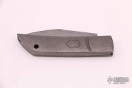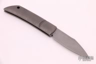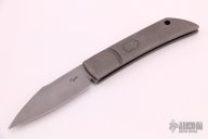 This Hughes Pattern Slipjoint by Chris Taylor features a "Dark" finished blade. The handle has tumbled titanium covers with a "Silhouette" shield, tumbled stainless steel spring. This knife has hidden hardware. Has half-stop. Comes with a zippered case and COA dated 9-4-21. New from maker at the 2021 USN Gathering.