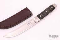 This Integral Tanto by Edmund Davidson features a hand rub satin finished hollow ground blade, .245" blade stock at the ricasso and 1.181" blade depth, integral construction with black canvas micarta inlays. Comes with a brown leather sheath marked "ED" on the back. Tang is signed "1st Model" and "2-2-2004". Excellent condition. This is a beautiful piece of Edmund Davidson history. Comes with a zippered case.