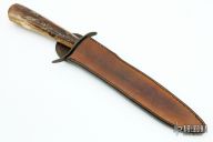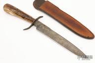 This Fighter by Journeyman Smith Rob Patton features a recurve Damascus blade with a false top edge, .208" blade stock and 1.201" blade depth, hidden tang construction. The handle has a steel guard and an Artifact fossil walrus ivory grip. This piece of artifact fossil walrus ivory has fire spindle holes and a small hole for a lanyard, very cool piece of material. Comes with a brown leather sheath. Excellent condition.