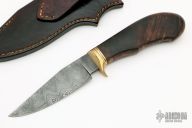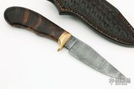 This knife by Jarrett T. Cieslak features a Ladder Pattern Damascus blade with .145" blade stock and 1.214" blade depth, hidden tang construction. The handle has a pinched and fluted brass guard, nicely figured wood grip. Comes with a hand tooled brown leather sheath. New from maker at the 2021 USN Gathering.