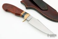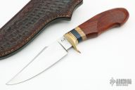 This knife by Jarrett T. Cieslak features a hand rub satin finished blade with hamon, .122" blade stock and 1.214" blade depth, hidden tang construction. The handle has a pinched and fluted brass guard, nicely figured wood grip. Comes with a hand tooled brown leather sheath. New from maker at the 2021 USN Gathering.