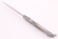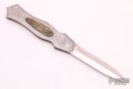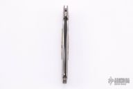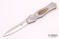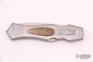 This automatic from Rendon Griffin features a mirror polished blade with false top edge and fileworked spine. The handle has a Damasteel frame and rocker bar, stainless steel fileworked backspacer, mammoth ivory inlays. Nice blade seating and action, has a little vertical blade play. Has a couple of scratches, otherwise excellent condition. Comes with a zippered case.