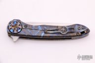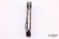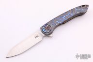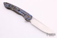 This Cruze Flipper by Curtiss knives features a satin finished blade with notched thumbrest and flipper. The handle has a flamed titanium frame with matching titanium backspacer and tip up clip. Has stainless lockface insert, nice detent, lockup and blade seating, rides on bearings. Has anodized hardware. Comes with a zippered case and COA dated 8-2-19. Excellent Condition.