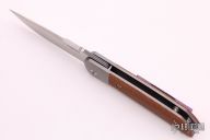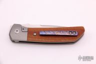 This Mula Front Flipper by Enrique Pena features a hand rub satin finished drop point blade with swedge, notched thumbrest and front flipper. The handle has a blasted titanium frame with natural canvas micarta inlays, and a tip up mokuti clip. Nice detent, lockup and blade seating. Comes with zippered case. New from maker at the 2021 USN Gathering.