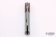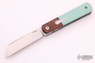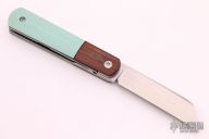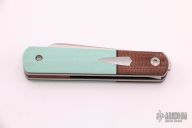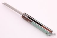 This Barlow Front Flipper Linerlock by Enrique Pena features a hand rub satin finished blade with front flipper and notched thumbrest. The handle has brown canvas micarta bolsters, Tiffany Blue G-10 scales with a stainless steel escutcheon, black liners, titanium liners and natural canvas micarta backspacer. Comes with a zippered case. New from maker at the 2021 USN Gathering.