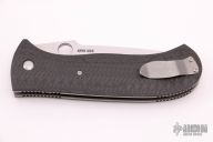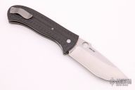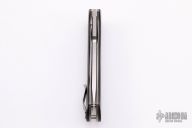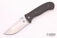 This custom XL FM1 by Les George features a hand rub satin finished blade with thumbhole. The handle has carbon fiber scales, tumbled titanium liners and tip up clip. Nice detent, lockup and blade seating. Very smooth action. This piece is in excellent condition and shows no signs of use or carry. Comes with a zippered case.