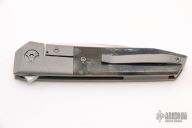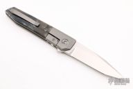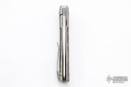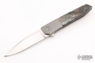 This PRIML Bolsterlock flipper by Jared Oeser features a hand rub satin finished blade with a notched flipper. The handle has a bead blasted titanium frame with a matching tip up clip and a zirconium backspace has mammoth ivory scales,. Nice detent, lockup and blade seating. Comes with original box, cloth and COA dated 9-3-21. New from maker at the 2021 USN Gathering.